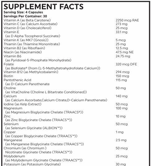 Cardiac health is reinforced by red beet powder, lutein, zeaxanthin, beta carotene, Vitamin E, magnesium, lycopene, potassium, arginine, and CoQ10. Carotenoids like lutein, beta carotene, zeaxathin, and lycopene decrease reactive oxygen species (ROS) which can help reduce atherosclerosis. Studies suggest that supplementing with red beet root juice may enhance oxygen delivery and reduce the workload of the heart. Beet extract was shown in a 2016 study to regulate blood pressure, cholesterol, and the inflammatory marker hsCRP. For homocysteine management, this multivitamin contains B6, B12 and folate, to support methylation and the recycling of homocysteine. L-Arginine is a semi-essential amino acid that enhances production of the vasodilator nitric oxide. It is used clinically in conditions that are improved by vasodilation like heart failure, kidney failure, erectile dysfunction, and intermittent claudication.